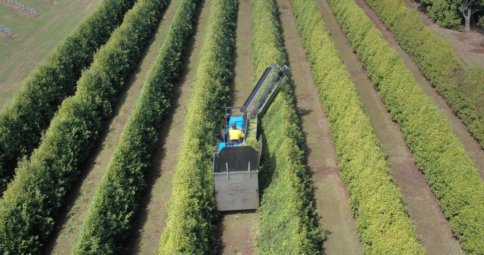 We have developed specialised harvesting equipment that we designed ourselves. A mechanical harvester with a reciprocating cutting blade prunes the leaves. A sweeper helps the cutting process and also directs the leaves onto a conveyor, which in turn carries them into the field bin. This process allows us to cut clean, neat, and do a considerable amount of work in a small space of time.