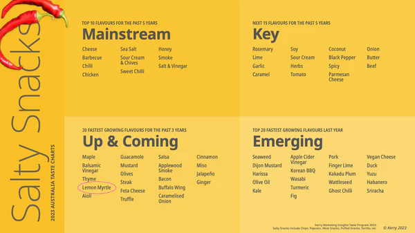 Once again the same categories Lemon Myrtle made it onto the Up and Coming List - the 20 fastest growing flavours for the past 3 years.
