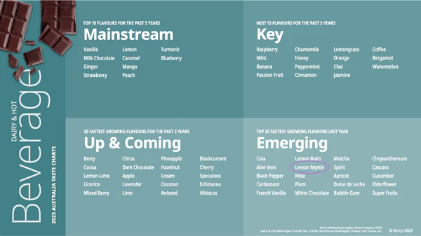 Lemon Myrtle has been included in several Kerry 2023 categories including savoury/up and coming, water and cold beverage/emerging, dairy and hot beverage emerging, salty snacks/up and coming, sweet/up and coming. It also made it in the nutrition category as a natural flavour enhancer or food ingredient under natural, organic, healthy mood support, microbiome, plant-based prebiotic anti-ageing, well aging calm sleep antioxidant, and anti-inflammatory sections.