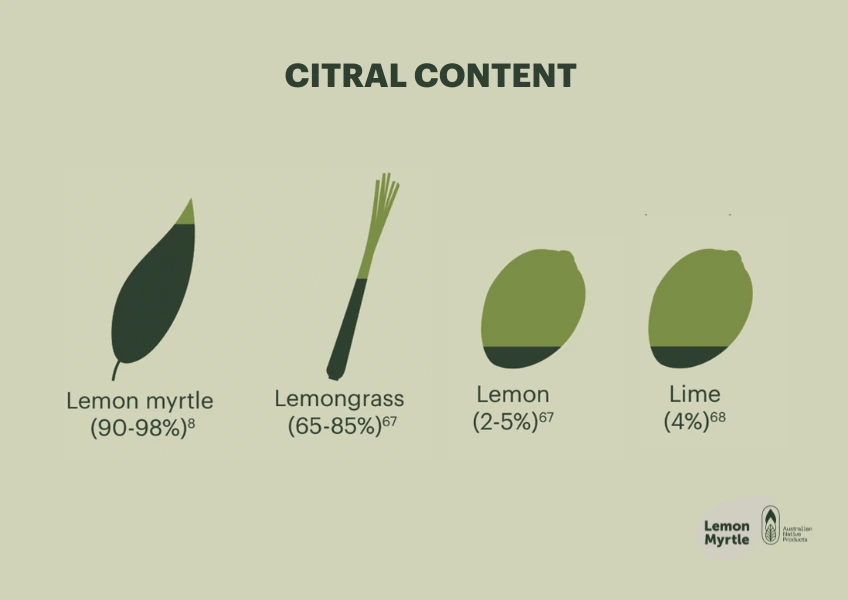 Citral is the special compound that gives lemons, lemongrass, lemon verbena and citronella their refreshing citrus taste and aroma. But of all the lemon herbs, it’s actually Australian native Lemon Myrtle that has the highest known source of citral, yielding more than 90%.