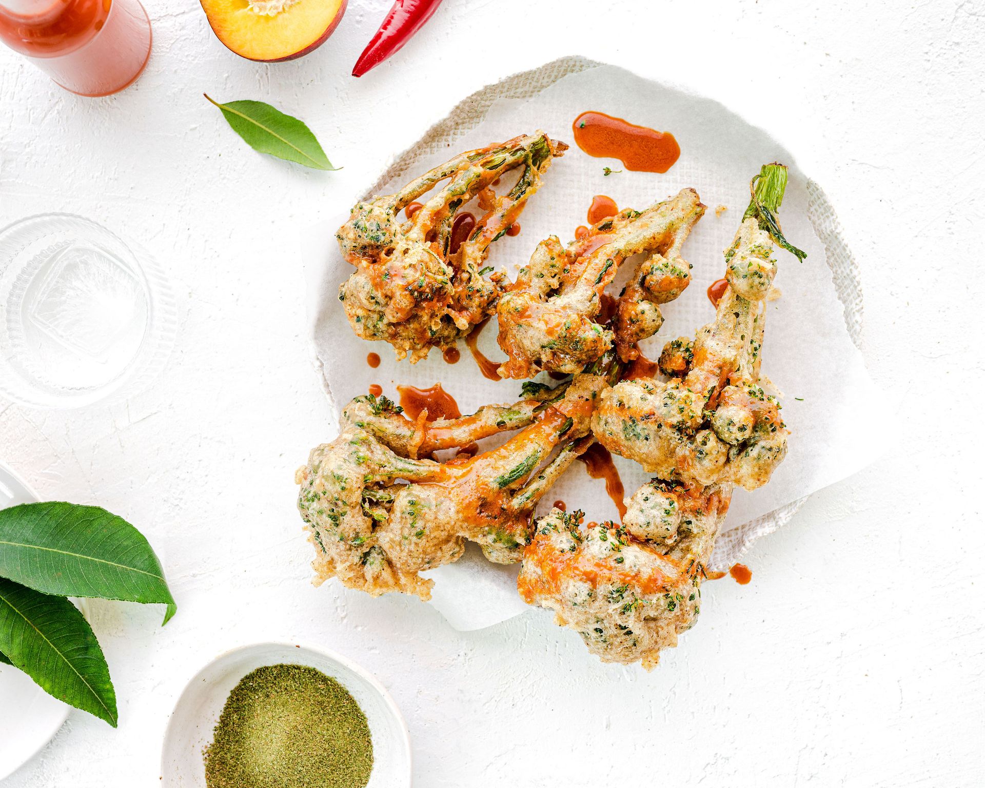And right here, Simon has paired it with his fried broccolini. Crispy, crunchy, on the outside, soft and delicious on the inside covered in this amazing hot sauce. I mean come on…. What more could you want?